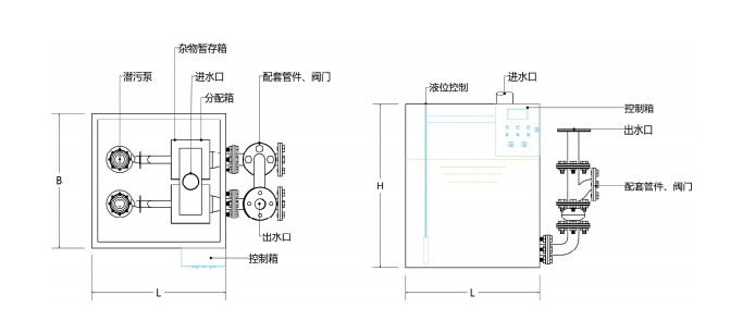 HWT-FC型污水提升設備是通過集水箱收集低于系統管網的污廢水,利用提升泵將其提升至室外排水管網中的一個高度集成的污水排放系統。由集水箱、雜物暫存箱、污水泵、自動液位計和電氣控制裝置組成。
